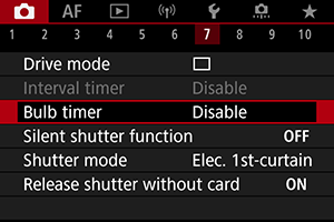 - Z dolgimi osvetlitvami lahko fotografirate tudi z brezžičnim daljinskim upravljalnikom BR-E1 (v prodaji posebej). Ko pritisnete na oddajni gumb na daljinskem upravljalniku, se dolga osvetlitev začne takoj ali po 2 sekundah. S ponovnim pritiskom na gumb ustavite dolgo osvetlitev.