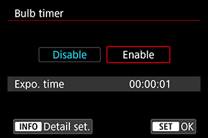 Trajanje osvetlitve za dolge osvetlitve lahko nastavite vnaprej. Ta funkcija odpravi potrebo po pritiskanju na gumb zaklopa med dolgimi osvetlitvami, to pa lahko odpravi tudi učinek tresenja fotoaparata.