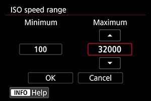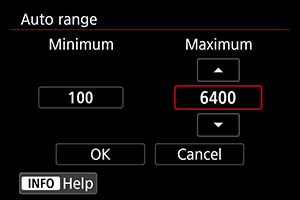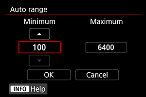 Razpon občutljivosti ISO (najnižjo in najvišjo mejo) lahko nastavite ročno. Minimalno mejo lahko nastavite v razponu ISO 100 do ISO 32000 in maksimalno mejo v razponu od ISO 200 do H (ekvivalent ISO 51200).