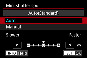 - Če je nastavljeno [Auto(Standard)/Samodejno(Standardno)], bo najnižja hitrost zaklopa obratno sorazmerna z goriščno razdaljo objektiva. En korak od [Slower/Počasneje] do [Faster/Hitreje] je enak enemu koraku hitrosti zaklopa.