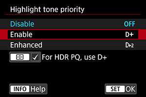 - [Enhanced/Izboljšano]: Pod nekaterimi pogoji fotografiranja ta nastavitev zmanjša intenzivnost preveč osvetljenih območij celo bolj kot nastavitev [Enable/Omogoči].