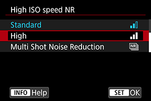 Ta nastavitev omogoči odpravljanje šuma pri višji kakovosti slike kot [High/Visoko]. Za eno fotografijo so zajeti zaporedoma štirje posnetki in samodejno poravnani ter združeni v eno sliko JPEG.