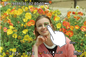 - Na mestu, ki se ga dotaknete, fotoaparat izostri (AF na dotik) z izbrano metodo v Območje AF.
