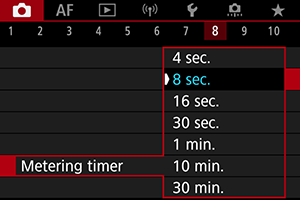 Nastavite lahko, kako dolgo deluje časovnik za merjenje osvetlitve (kar določa trajanje prikaza vrednosti osvetlitve/zaklepa AE), potem ko se sproži zaradi postopka, kot je na primer pritisk na gumb zaklopa do polovice.
