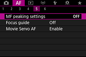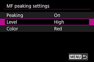 - Obrisi pri MF bodo morda manj razločni pri visokih občutljivostih ISO, še posebej, če je nastavljena razširitev ISO. Če je potrebno, znižajte občutljivost ISO ali nastavite [Peaking/Poudarek obrisov] na [Off/Izklop].