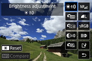 Kromatična popačenja (cepljenje barve ob obrisih predmeta), ki so posledica lastnosti objektiva, lahko popravite. Če je nastavljeno [Enable/Omogoči], bo prikazana popravljena slika. Če učinek težko razločite, povečajte sliko ().