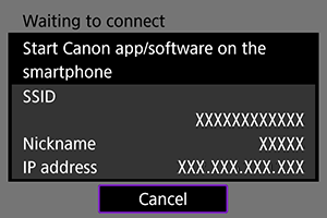 Za vzpostavitev povezave vpišite SSID druge naprave. Za dokončanje nastavitev povezave upoštevajte navodila na zaslonu fotoaparata.