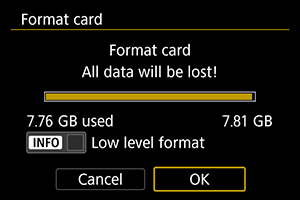 • Med formatiranjem na osnovnem nivoju lahko prekličete formatiranje z izbiro [Cancel/Preklic]. Tudi v tem primeru bo normalno formatiranje izvedeno in kartico boste lahko uporabljali kot običajno.