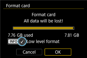 • Za formatiranje na osnovnem nivoju s pritiskom na gumb INFO dodajte znak kljukice [Kontrolni znak] nastavitvi [Low level format/Formatiranje na osnovnem nivoju], nato izberite [OK].