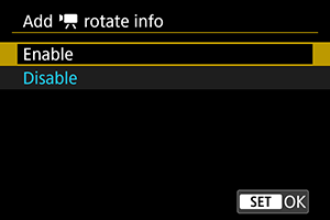 Za filme, ki jih snemate s fotoaparatom, ki ga držite navpično, lahko nastavite samodejno dodajanje podatka o tem, katera stran je obrnjena navzgor, in tako omogočite predvajanje v isti usmerjenosti na pametnem telefonu ali drugih napravah.