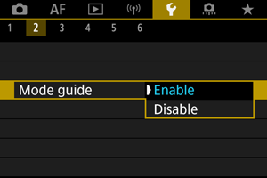 Ko vključite posamezne načine fotografiranja, lahko nastavite prikaz kratkega opisa načina. Privzeta nastavitev je [Enable/Omogoči].