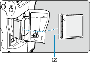 - Kartica CFexpress: Kartico, s stranjo z nalepko obrnjeno proti sebi, vstavite z odprto stranjo kartice (2) v režo za kartico. Če je kartica vstavljena v napačni smeri, lahko poškoduje fotoaparat.