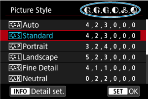 Dodate lahko nov stil slike na osnovi predhodnih nastavitev, na primer [Portrait/Portret] ali [Landscape/Pokrajina] ali datoteko s stilom slike in jih zatem prilagodite po želji (). Pri uporabi katerega koli uporabniškega stila slike, ki še ni bil registriran, bodo slike zajete z istimi nastavitvami značilnosti kot s privzetimi nastavitvami za [Standard/Standardno].