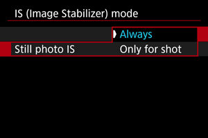 Izberite [Still photo IS/IS za fotografijo].