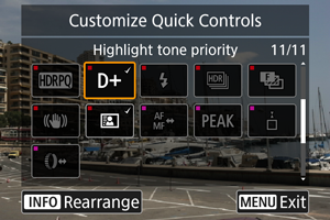 - Postavke, ki so prikazane na zaslonu hitrega krmilnika, so označene s kljukico. Postavke brez kontrolnega znaka (kljukice) bodo odstranjene.