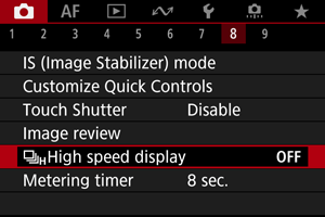 - Prikaz z visoko hitrostjo ne deluje pri hitrostih zaklopa, počasnejših od 1/30 sek., vrednostih zaslonke, višjih od f/11, pri pogojih, ki otežujejo samodejno ostrenje, pri fotografiranju z bliskavico ali pri razširjeni ISO občutljivosti Lahko se tudi ustavi med fotografiranjem.