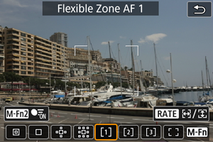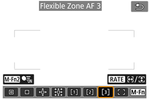 Točko AF ali okvir za Zone AF/Območno AF lahko izberete ročno. Kot primer prikazujemo tukaj zaslone za funkcijo Flexible Zone AF 1/Fleksibilno območje AF 1.