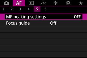 : Vodilo pri ostrenju] na [On/Vklop] aktivira okvir z vodilom, ki kaže, v katero smer prilagodite ostrino in zahtevano raven prilagoditve. Za prikaz vodila pri ostrenju v želenem položaju lahko uporabite očesno kontrolo. Podrobnosti poiščite v Uporaba očesne kontrole za AF.