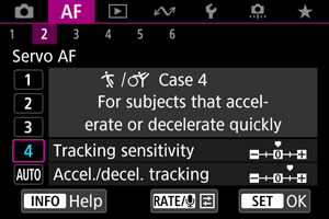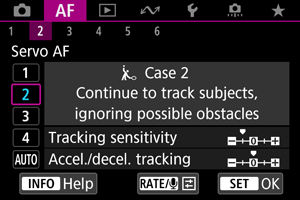 V naslednjih okoliščinah izberite postavke od [Case 2/Primer 2] do [Case 4/Primer 4]: za predmete, ki niso predmeti posnetka in se premikajo preko točk AF, izmuzljive predmete ali predmete, ki se pojavijo nenadoma in spreminjajo hitrost.