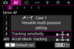 Fotoaparat bo še naprej poskušal ostriti predmet, čeprav se preko točk AF premikajo predmeti, ki niso predmeti posnetka ali se predmet odmakne od točk AF. Nastavitev -2 omogoči fotoaparatu sledenje ciljnemu predmetu dlje časa kot nastavitev -1.