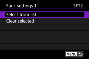 Izbira [Select from list/Izbira iz seznama] navede seznam nastavitev funkcije, shranjenih v fotoaparatu. Izberite nastavitve funkcije, ki jih želite uporabiti.