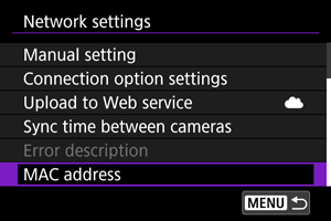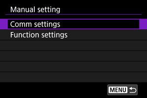 : Shranjevanje/prenos nastavitev fotoaparata na kartico] omogoča, da shranite vse nastavitve komuniciranja v fotoaparatu na kartico ali jih s kartice prenesete v drug fotoaparat.
