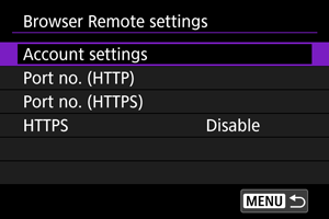 Izbira [Browser Remote settings/Nastavitve daljinskega brskalnika] omogoča nastavitev računa za dostop v Browser Remote/Daljinski brskalnik in konfiguracijo nastavitev komuniciranja v okviru HTTP/HTTPS.