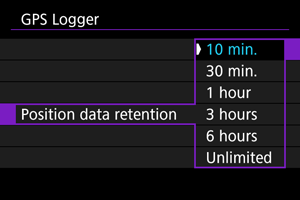 Če želite z uporabo geografskih podatkov v okviru zabeleženih podatkov še naprej označevati slike z geografskimi podatki, čeprav je signal s satelita slab (če greste v zaprt prostor, na primer), priporočamo, da nastavite [Position data retention/Ohranitev podatkov položaja] na [Unlimited/Neomejeno]. Dokler niso pridobljeni novi podatki, so zabeleženim podatkom dodani zadnji pridobljeni geografski podatki.