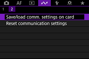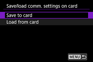 : Shranjevanje/prenos nastavitev fotoaparata na kartico] omogoča, da shranite vse nastavitve komuniciranja v fotoaparatu na kartico ali jih s kartice prenesete v drug fotoaparat.