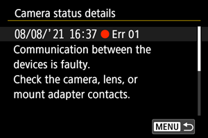 Preverite lahko dnevnik preteklih napak ter zgodovino uporabe objektiva, bliskavice in baterije ob pojavu napake.