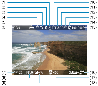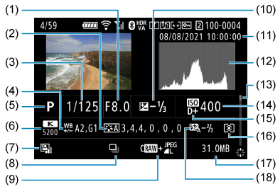 - Za slike, zajete v načinu zajemanja RAW+JPEG/HEIF, označuje velikosti RAW datotek.