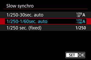 - Za uporabo funkcije slow synchro v načinu P ali načinu Av izberite nastavitev [1/250-30sec. auto/1/250-30 sek. samodejno].