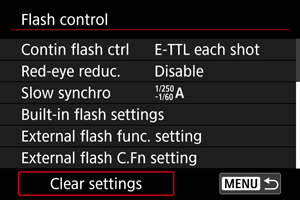 - Izberite [Clear built-in flash set./Izbris nastavitev vgrajene bliskavice], [Clear external flash set./Izbris nastavitev zunanje bliskavice] ali [Clear ext. flash C.Fn set./Izbris nastavitev C.Fn zunanje bliskavice].