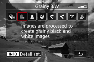 - Pri načinu [Grainy B/W/Zrnata Č-B fotografija] bo slika pri predogledu videti nekoliko drugače kot končna zajeta slika.