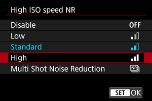 Ta nastavitev omogoči odpravljanje šuma pri višji kakovosti slike kot [High/Visoko]. Za eno fotografijo so zajeti zaporedoma štirje posnetki in samodejno poravnani ter združeni v eno sliko JPEG.