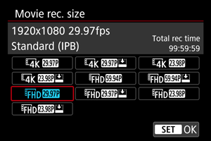 Ločljivost snemanja filma, hitrost sličic in metodo stiskanja lahko nastavite v [: Movie rec. size/