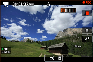 Če uporabljate kartico z nizko hitrostjo zapisovanja, se med snemanjem lahko na desni strani zaslona prikaže indikator. Indikator kaže, koliko podatkov še ni bilo zapisano na kartico (preostala zmogljivost notranjega medpomnilnika) in se tem hitreje zvišuje, čim počasnejša je kartica. Če indikator (1) doseže polno višino, se snemanje filma ustavi samodejno.
