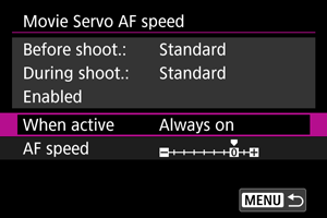 Nastavite lahko [Always on/Vedno vključeno], tako da vedno velja učinek hitrosti AF za snemanje filma (pred in med snemanjem filma) ali nastavite [During shooting/Med snemanjem], tako da velja hitrost AF samo med snemanjem filma.