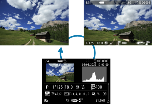 Ko so na zaslonu prikazani podatki o fotografiranju (), lahko s pritiskom na regulator navzgor ali navzdol pregledujete druge podatke. Prikazane podatke lahko prilagajate v okviru nastavitve [
