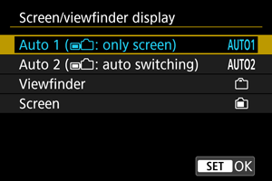 - Med prikazom v iskalu in na zaslonu lahko preklopite tudi s pritiskom na gumb, ki ste ga prilagodili z dodelitvijo možnosti preklopa. S to nastavitvijo nastavljeno na [AUTO1/SAMODEJNO1] ali [AUTO2/SAMODEJNO2] se fotoaparat ustrezno odziva na tipalo iskala.