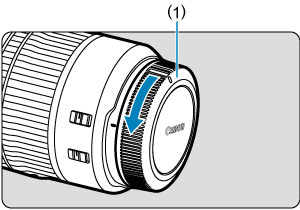 - Odstranite zadnji pokrov objektiva (1) in pokrov fotoaparata (2), tako da ju zavrtite v smeri puščice, kot kaže ilustracija.