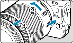 Med pritiskanjem na gumb za sprostitev objektiva zavrtite objektiv, kot kaže puščica.