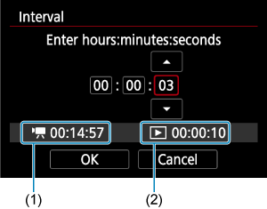 Označuje čas snemanja filma (čas, potreben za predvajanje filma), ko ustvarjate časovno pospešeni film v formatu 4K ali Full HD iz fotografij, zajetih v nastavljenih intervalih.