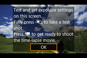 - Priporočamo, da za časovno pospešene filme vnaprej naredite poskusne posnetke kot v koraku 12 ali celo posnamete poskusni časovno pospešeni film.