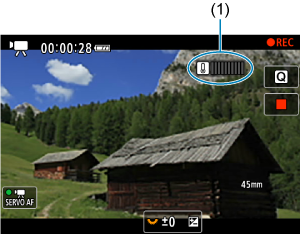 Če uporabljate kartico z nizko hitrostjo zapisovanja, se med snemanjem lahko na desni strani zaslona prikaže indikator. Indikator kaže, koliko podatkov še ni bilo zapisano na kartico (preostala zmogljivost notranjega medpomnilnika) in se tem hitreje zvišuje, čim počasnejša je kartica. Če indikator (1) doseže polno višino, se snemanje filma ustavi samodejno.