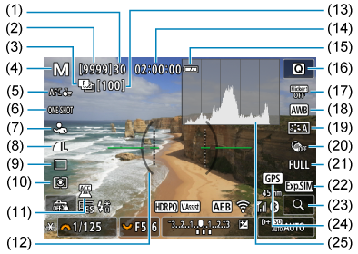 - 2: Prikazano, če ima pritrjeni objektiv podatke o razdalji. Pri podaljšku objektiva ali objektivu za bližnjo fotografijo se prikazana ikona morda ne bo ujemala z dejanskim prizorom.