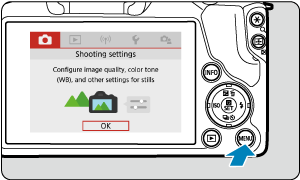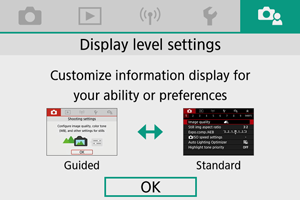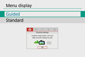 Vrsto prikaza menija lahko izberete med možnostma [Standard/Standardno] ali [Guided/Z vodičem]. Če izberete nastavitev [Guided/Z vodičem], fotoaparat po pritisku na gumb prikaže opise glavnih nastavitev polja. Če izberete nastavitev [Standard/Standardno], fotoaparat ob pritisku na gumb