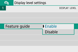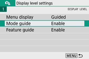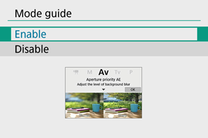 Ko vključite posamezne načine fotografiranja, lahko nastavite prikaz kratkega opisa načina. Privzeta nastavitev je [Enable/Omogoči].