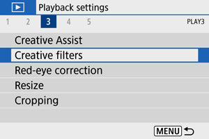 Za sliko lahko uporabite naslednje ustvarjalne filtre in shranite sliko kot novo sliko: Grainy B/W/Zrnata Č-B slika, Soft focus/Mehčanje ostrine, Fish-eye effect/Učinek ribjega očesa, Art bold effect/Učinek oljne umetniške slike, Water painting effect/Učinek akvarela, Toy camera effect/Učinek otroškega fotoaparata in Miniature effect/Učinek miniature.