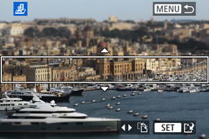 Ustvari učinek diorame. Spreminjate lahko področje, kjer bo slika videti izostrena. Za preklop med navpično in vodoravno usmerjenostjo izostrenega območja (beli okvir) pritisnite tipki